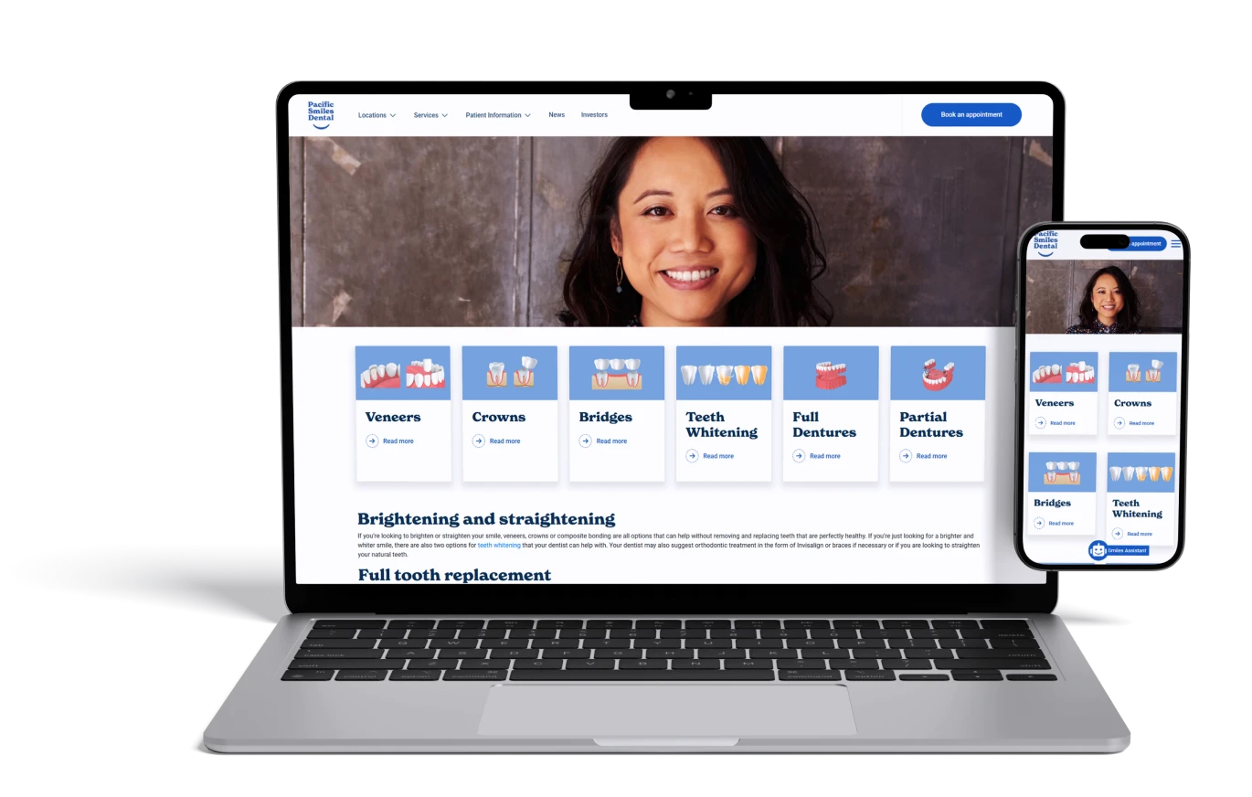 Using a data-driven design approach, we created a modern and user-friendly website that inspires trust and confidence in potential patients. The website provides clear and accessible information about Pacific Smiles Dental’s services, including general dentistry, preventative care, cosmetic dentistry, and orthodontics. High-quality visuals showcase their cutting-edge facilities and welcoming dental professionals. To enhance the user experience, we integrated a seamless appointment booking system and an interactive location finder, making it easy for patients to find and book services at the nearest clinic.